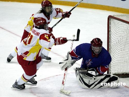 2月24日,第二十四屆世界大學(xué)生冬季運動會女子冰球小組賽最后一輪的比賽在哈爾濱冰球館結(jié)束,在晚間結(jié)束的比賽中,中國隊以8比0大勝英國。這樣中國女冰就以小組第二的身份晉級半決賽,在半決賽中她們將面對小組第三的芬蘭。圖為中國隊(白)破門得分。中新社發(fā) 富田 攝