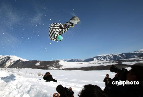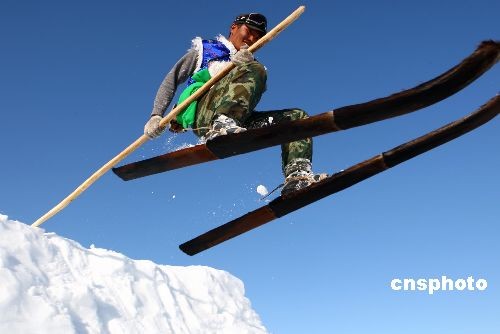 3月6日,首屆新疆喀納斯“雪上飛”杯單板野雪超級(jí)大回轉(zhuǎn)邀請(qǐng)賽,在新疆著名的旅游景點(diǎn)——喀納斯禾木村舉行,來自新疆各地7家滑雪場(chǎng)和單板俱樂部的37名選手參加比賽,演繹高山野雪的驚險(xiǎn)與刺激。比賽間隙,專業(yè)運(yùn)動(dòng)員進(jìn)行的單板跳臺(tái)特技表演與當(dāng)?shù)啬撩襁M(jìn)行的阿勒泰古老毛滑雪板表演令參賽選手大飽眼福。中新社發(fā) 劉新 攝