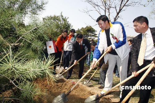 4月4日,首都第25個義務(wù)植樹日,北京林業(yè)大學(xué)以“建國60周年”和“五四”運動90周年為契機開展“為華夏播綠,向祖國獻禮”首都大學(xué)生第十三屆“綠橋”活動暨第三屆全國青少年綠色長征接力活動。開幕儀式上首都大學(xué)生聘請王治郅、林依倫、阿寶、張湘祥等文藝、體育明星擔任第八屆首都大學(xué)生“綠色志愿大使”暨“綠色長征形象大使”。圖為王治郅首都義務(wù)植樹日上植樹。中新社發(fā) 鄭雄增 攝