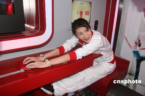 4月18日,悉尼奧運(yùn)會(huì)女子雙人10米臺(tái)跳水冠軍李娜在大篷車?yán)餃y(cè)試柔韌性。當(dāng)日,2009年“李寧英雄大篷車”巡游活動(dòng)在湖南岳陽啟動(dòng),體育愛好者們可通過大棚車?yán)锏母鞣N設(shè)備來測(cè)試自己的速度、柔韌、靈敏、平衡等運(yùn)動(dòng)素質(zhì),從而了解自身的各項(xiàng)運(yùn)動(dòng)機(jī)能水平。中新社發(fā) 鄧霞 攝