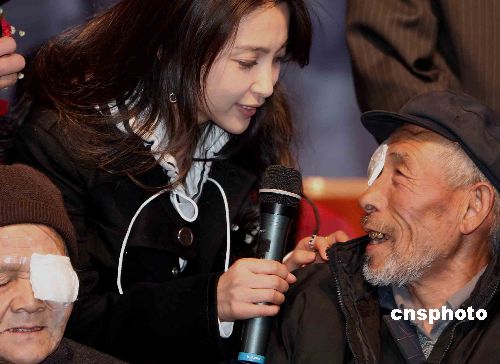 中國演藝明星李冰冰,1月28日在陜西省蒲城慰問剛剛通過慈善手術(shù)復明的貧困農(nóng)民白內(nèi)障患者。當日揭牌的“陜西蒲城‘亮睛’扶貧眼科中心”,是由香港醫(yī)學界熱心人士發(fā)起、在香港注冊成立的“亮睛工程慈善基金”實施的“亮睛工程”的一部分,該工程計劃未來五年在中國人口多的貧困地區(qū)設(shè)立100個扶貧眼科中心(亮睛點),每個中心每年實施1000例白內(nèi)障手術(shù),大力協(xié)助中國的扶貧除盲重任。中新社發(fā) 任晨鳴 攝