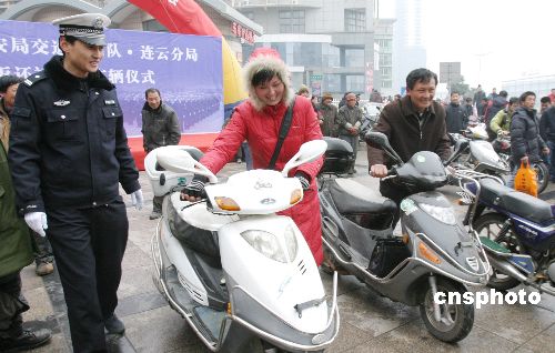 1月28日,連云港市公安局交巡警支隊(duì)和連云公安分局集中返還176輛被盜搶機(jī)動(dòng)車。去年以來,連云港警方嚴(yán)厲查處各類機(jī)動(dòng)車違法行為,加大盜搶車輛的犯罪行為的打擊力度。眾多失主在這批案值約100萬元的被盜搶車輛中,現(xiàn)場(chǎng)將自己被盜搶車輛領(lǐng)到了手中。中新社發(fā) 王健民 攝