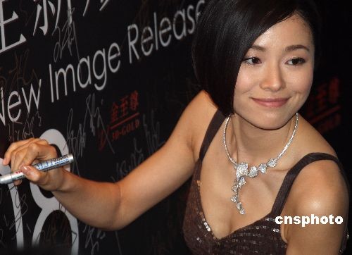 2月28日晚,香港紅星陳慧琳佩戴著價值千萬的珠寶,在北京舉行的香港“金至尊珠寶”2008新形象發(fā)布會上亮相。同時亮相的還有藝人張恒、唐嫣、高露、江一燕、丁柳元、陳虹池以及名模春曉等。中新社發(fā) 錢興強 攝