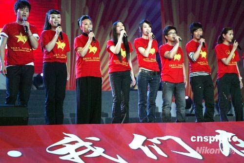 5月25日晚,由13家國(guó)家一級(jí)社會(huì)組織共同主辦的“情暖汶川·我們?cè)谛袆?dòng)——全國(guó)社會(huì)組織抗震救災(zāi)募捐義演”在北京首都體育館舉行,來(lái)自社會(huì)各界的1萬(wàn)余名觀眾參加了此次募捐活動(dòng)。現(xiàn)場(chǎng)籌得款物將通過中華慈善總會(huì)全部捐給地震災(zāi)區(qū)。中新社發(fā) 趙雋 攝