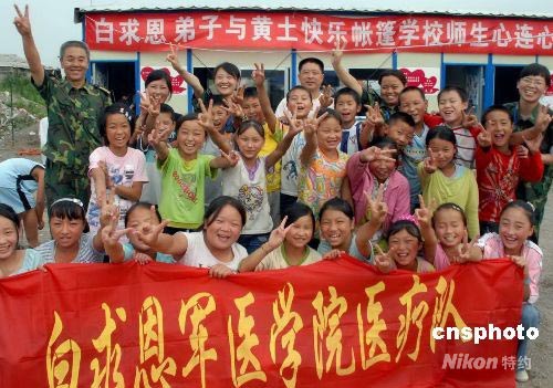 解放軍石家莊白求恩軍醫(yī)學(xué)院派出的心理支援隊,近日來到四川省安縣黃土鎮(zhèn)“快樂帳篷學(xué)校”,向孩子履行心理支援義務(wù),收到良好效果。中新社發(fā) 尹威華 攝
