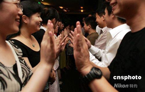 7月19日,眾多北京青年在集體相親會上拍手互動,在活動中尋找自己的愛情。參加此次活動的單身青年大多來自某婚戀網(wǎng)站,很多參加相親活動的年輕人表示,對于自己理想伴侶的要求更多的是希望相互性格、志向、情趣相投。借助婚戀網(wǎng)站平臺線上線下活動去尋找物質(zhì)生活和精神生活完美統(tǒng)一的伴侶。就像徐志摩的詩,“我將在茫茫人海中尋訪我唯一之靈魂伴侶。得之,我幸;不得,我命!币晃粎⒓踊顒拥哪贻p人笑談,如果徐志摩生活在當(dāng)下,一定也會通過婚戀網(wǎng)找到自己“唯一之靈魂伴侶”的。中新社發(fā) 楊可佳 攝