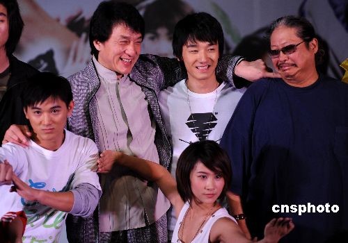 十月十八日,香港影星成龍、洪金寶在北京向人們力薦主演電影《武術(shù)之少年行》的三位武術(shù)新銳。洪金寶擔(dān)綱主演該片,成龍出任該片監(jiān)制。而該片主演劉峰超(前排右一)是全國劍術(shù)冠軍,王文杰(前排左一)也是一名新銳武打演員。該片影片將于十月二十四日在全國上映。中新社發(fā) 廖攀 攝