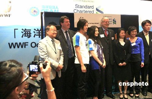 圖為世界自然基金會香港分會行政總裁龐毅理、渣打銀行(香港)有限公司香港區(qū)公共事務(wù)處主管廖碧瑩、海洋見證人鄭伊健及楊采妮等利用海洋生物(道具)砌出大型“海洋寶盒”并合影。