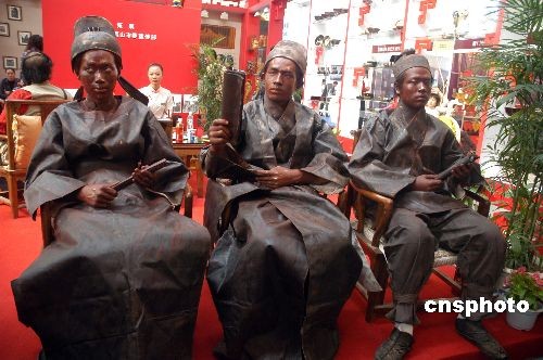 2008年11月16日,在武夷山第二屆海峽兩岸茶業(yè)博覽會(huì)上,三尊會(huì)動(dòng)的雕塑吸引了眾多前來(lái)觀展的市民關(guān)注不少人紛紛拍照和“古人”合影留念。中新社發(fā) 張 斌 攝