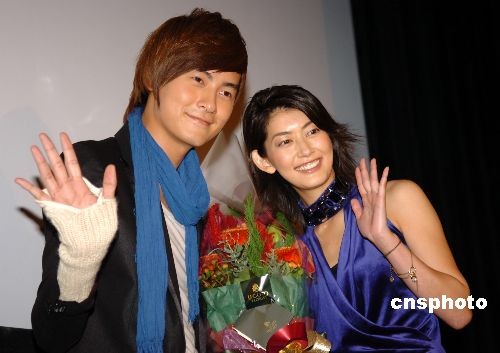 11月18日,臺(tái)灣人氣小生鄭元暢在東京助陣日本版《惡作劇之吻》的DVD發(fā)賣,并首次與日版“相原琴子”的扮演者佐藤蘭子碰面。二人本別披露各自的拍攝內(nèi)幕,令現(xiàn)場(chǎng)近二百名粉絲大笑不已。圖為鄭元暢與佐藤蘭子在活動(dòng)現(xiàn)場(chǎng)向合影。中新社發(fā) 朱沿華 攝