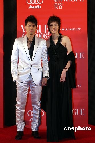 V0GUE2008年度盛典12月6日夜在北京銀泰中心舉行。羽壇“神雕俠侶”林丹、謝杏芳情侶檔高調(diào)亮相十指相扣走上紅毯秀甜蜜,林丹穿著休閑西裝搭配三顆扣子解開的襯衣,謝杏芳也一改賽場上的樸實,一身黑色露肩晚禮服,手拿精致小香包,女人味十足。林丹一路都非常體貼的輕挽著女友,兩人果真是金童玉女般的完美組合。中新社發(fā) 楊可佳 攝