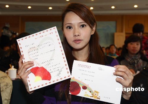 12月22日,愛心大使伊能靜在北京出席“新長(zhǎng)城5·12災(zāi)區(qū)學(xué)生新春關(guān)愛行動(dòng)”啟動(dòng)儀式,并在愛心賀卡上親手為四川災(zāi)區(qū)小學(xué)生寫下新年祝福,這封賀卡將寄往映秀小學(xué)5年紀(jì)的賀華偉同學(xué)。參加活動(dòng)的市民只需花費(fèi)10元人民幣,就可為災(zāi)區(qū)學(xué)生郵寄一枚新年愛心賀卡,其中還包含有為“自強(qiáng)獎(jiǎng)學(xué)金”捐獻(xiàn)的善款。首批賀卡是寄給映秀小學(xué)學(xué)生的,他們將最先收到這份新年禮物。中新社發(fā) 杜洋 攝