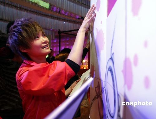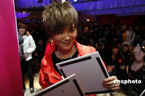 12月下旬,人氣藝人李宇春在北京出席新銳配飾品牌ctf2舉辦的“2008我的彩色夢想”頒獎儀式,并與眾多時尚彩繪愛好者進(jìn)行互動游戲。該活動上展示了ctf2在2008年從全國10所高校與社會征集來的近千幅CoCo Cat新形象作品,揭曉2009年ctf2 CoCo女郎最新形象。李宇春現(xiàn)場為獲獎?wù)哳C獎。中新社發(fā) 楊可佳 攝