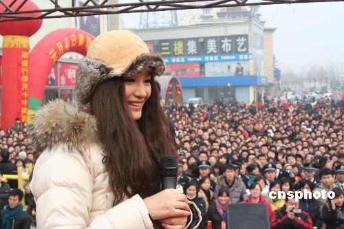 2009年1月4日下午,中國(guó)著名模特瞿穎向在邢臺(tái)上學(xué)的四川災(zāi)區(qū)學(xué)生捐贈(zèng)保暖衣50套,為他們送去冬日里的溫暖。中新社發(fā) 陳雷 攝