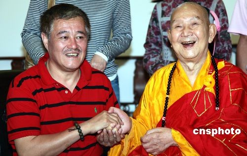 在海南三亞度假的中國(guó)著名喜劇小品笑星趙本山,二月四日攜妻兒專程到南山景區(qū)參觀游覽。圖為他與南山寺方丈新成大和尚在一起喝茶暢談。中新社發(fā) 陳文武 攝