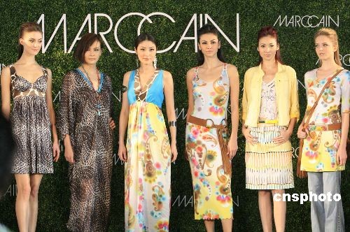 三月十九日,德國(guó)一家著名時(shí)尚品牌在香港舉辦春夏時(shí)裝發(fā)布,懷孕四個(gè)月的香港藝人陳慧琳身著時(shí)尚夏裝與名模馬詩(shī)慧、Rosemary等一同表演。中新社發(fā) 張勤 攝