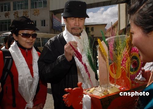3月24日,孫海英、呂麗萍夫婦受邀參加“5.12中國愛——中國嬌子愛心行動”,在西藏進行一系列愛心公益活動。抵達西藏,孫海英、呂麗萍夫婦受到當地民眾的歡迎,藏族美女給孫海英敬上了大碗青稞酒。中新社發(fā) 龍昊 攝