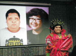 林思思原名劉輝,今年28歲,身高1.68米,體重卻足有140公斤,三圍都達(dá)到3尺9之多。昨日(9日)上午,為了讓記者看到他扮成楊貴妃的模樣,他花費(fèi)了1個(gè)多小時(shí)化妝,撲粉、描眉、上眼影,戴上高高的發(fā)髻,配上閃光的項(xiàng)鏈,再換上艷麗的彩綢古裝,輕輕一抬手,一個(gè)活脫脫的“楊貴妃”出現(xiàn)在記者面前。他還特意表演了一段“長袖善舞”,“貴妃味”十足。