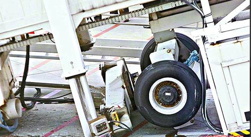 桃園國(guó)際機(jī)場(chǎng)航空站副主任張鐵源表示,經(jīng)查是空橋支柱與輪子間銜接處斷裂,初步排除是維修保養(yǎng)不足釀禍,今將請(qǐng)空橋韓國(guó)原廠代理商到現(xiàn)場(chǎng)檢測(cè),調(diào)查真正原因。