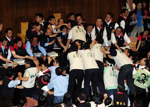 現(xiàn)場“立委”多人扭打成一團(tuán),民進(jìn)黨“立委”以潑水、丟東西等方式抗議,該黨“立委”郭玟成、劉建國跌下摔落,國民黨“立委”吳育升也受傷。