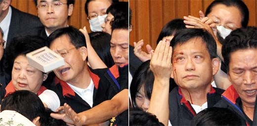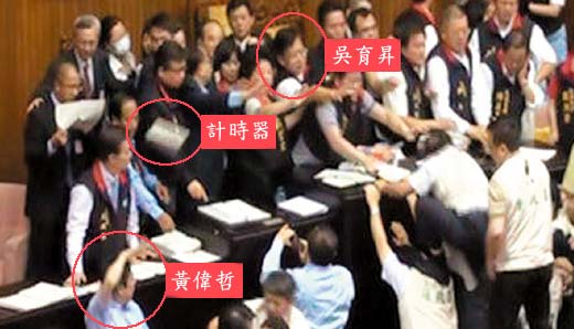 臺灣“立法院”臨時會昨天下午處理兩岸經(jīng)濟合作架構(gòu)協(xié)議(ECFA)徑付二讀時,藍綠發(fā)生推擠沖突,混亂中,吳育升遭定時器砸中。國民黨團昨晚召開記者會,調(diào)出錄影帶顯示是黃偉哲所砸。
