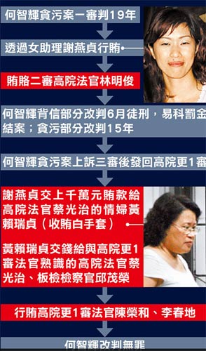特偵組透露,何智輝為了不被關(guān),以自己的女助理謝燕貞當行賄白手套,先行賄二審擔任受命法官的林明俊,林在何智輝所涉背信罪的部分,從一審判決2年到二審改判1年,然后適用2007年減刑條例,減為6個月,最后都獲易科罰金,貪污則改判15年。