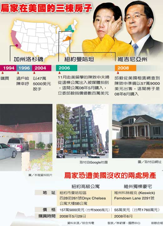依美方資料,扁家在紐約市近曼哈坦八大道鬧區(qū)的豪華公寓,售價一百五十七萬五千美元(約臺幣五千萬元),在○八年五月二十九日購買;在弗州要價五十五萬美元(約臺幣一千七百六十萬元)的獨(dú)棟住宅,在同年六月購得。