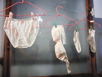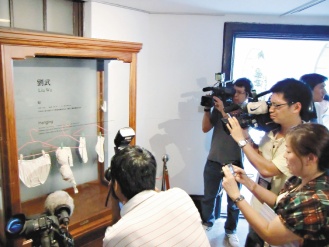 本周一上場(chǎng)、將展到年底的最新一批工藝作品中,劉武創(chuàng)作的“晾”,展示柜高掛女性內(nèi)衣褲、襪子,連日來引爆話題。昨日上午還有大批陸客圍觀,不少人竊竊私語說:“這真的是女兵內(nèi)衣褲嗎?”