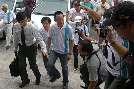 陳致中(前左 2)被《壹周刊》爆料疑涉召妓。陳致中26日由律師陪同到高雄地方法院提出民事告訴,向《壹周刊》求償新臺幣200萬元。 圖片來源:“中央社”