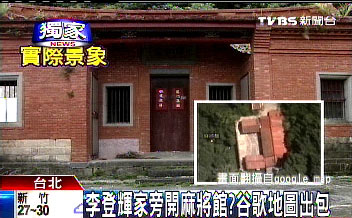 中新網(wǎng)8月3日電 谷歌地圖(google earth)在臺灣又惹上麻煩事,繼之前拍到窗臺裸女及路口“尿尿男”后,日前有民眾在谷歌地圖上發(fā)現(xiàn),李登輝的住家“翠山莊”旁邊有一間“麻將館”,誰知警察前往調(diào)查時,卻發(fā)現(xiàn)被標為“麻將館”的地方其實是空置的三合院。