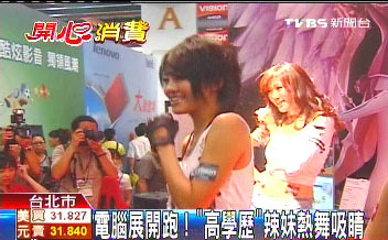 據(jù)臺灣TVBS電視臺報道,臺北計算機展大會舞臺還沒開鑼,參展廠商就派巧克力膚色辣妹開始搏版面,沒有舞臺就在展場地毯展現(xiàn)動感。有的廠商由于和隔壁搞競爭搶眼球,上午11點半的Show Gilr表演,足足提早1小時。