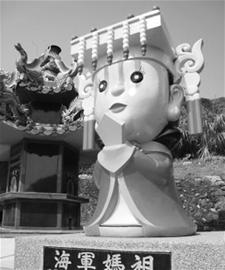 除了天顯宮,與臺(tái)軍方關(guān)系相當(dāng)密切的廟宇,還有蘇澳中正軍港內(nèi)的媽祖廟進(jìn)安宮。30多年來,進(jìn)安宮成為當(dāng)?shù)毓俦男叛鰧?duì)象,各型軍艦進(jìn)港都會(huì)前往祈福。去年底蘇澳民眾請(qǐng)示媽祖后,還捐資建立了一座高達(dá)3米的“海軍媽祖”石像(如圖),成為軍港的地標(biāo),據(jù)稱歷任海軍高級(jí)將領(lǐng)幾乎都會(huì)來這里上香。作為全臺(tái)唯一軍方與地方共管的廟宇,民眾到進(jìn)安宮參拜媽祖,還要先登記,并且只有假日才能進(jìn)香。