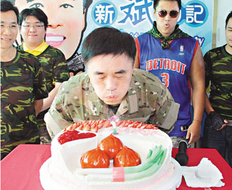 據(jù)報(bào)道,郝龍斌22日換上迷彩服與網(wǎng)友粉絲PK漆彈對戰(zhàn),同時(shí)也度過58歲生日;粉絲團(tuán)特別安排了兩位女兵,送上“蔥滿勝蒜”蛋糕,象征市長選舉“充滿勝算”。郝龍斌開心許下三個(gè)愿望:第一是風(fēng)調(diào)雨順,第二是希望花博圓滿成功,第三個(gè)愿望,“大家都知道,所以不說了!(應(yīng)指連任成功)”