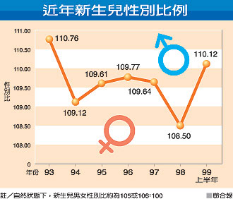 中新網(wǎng)8月30日電 據(jù)臺(tái)灣《聯(lián)合報(bào)》報(bào)道,臺(tái)灣人口結(jié)構(gòu)再惡化。2010年上半年出生率創(chuàng)歷年新低,新生兒性別失衡更急遽惡化,男女嬰幼兒比例為110:100,為近6年來最嚴(yán)重。此外,有婦產(chǎn)科學(xué)者指出,產(chǎn)婦在“傳宗接代”的壓下力,透過母血篩檢等手法,只為“求得一子”。