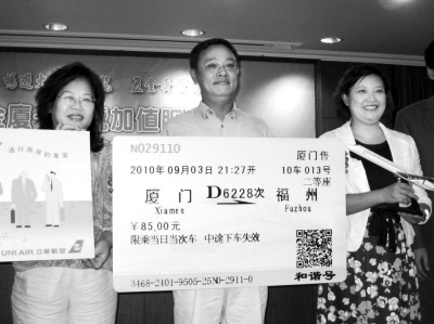 “11年前我就是搭第一班‘小三通’輪船去福州,今天(9月3日)又在臺(tái)灣買到了第一張動(dòng)車火車票,真是感慨萬分。我上次回福州還要自己在廈門排隊(duì)買車票,這次就不用了,真是太方便啦!3日上午,福州臺(tái)商張鳴齡先生興奮地從臺(tái)灣三菱旅行社總經(jīng)理周惠全手里接過車票模型,宣告大陸動(dòng)車車票在臺(tái)灣正式開賣。
