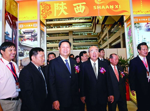 當日上午九時許,在悠揚古樸的秦腔曲牌聲中,“陜西風情節(jié)”在臺北世貿(mào)中心拉開帷幕,近百家企業(yè)的300多種產(chǎn)品吸引了諸多臺灣民眾。趙正永、景俊海和吳伯雄以及臺灣商業(yè)總會理事長張平沼等在參觀展覽之后,出席了活動開幕式。趙正永在致辭中說,兩岸經(jīng)濟具有很強的互補性,不斷加強交流與合作,對于應對國際金融危機和促進經(jīng)濟持續(xù)發(fā)展具有重要意義。隨著“三通”的實現(xiàn),陜臺兩地的交流合作領(lǐng)域不斷擴大、態(tài)勢越來越好。為進一步凝聚共識、互惠發(fā)展,在臺灣有關(guān)方面的大力支持下,我們赴臺舉辦包括“陜西風情節(jié)”等許多活動在內(nèi)的“2010臺灣陜西周”,相信這次活動會使臺灣企業(yè)和民眾更多地了解陜西,推動陜臺合作向更高層次發(fā)展。吳伯雄在致辭中對我省舉辦臺灣陜西周表示熱烈歡迎,他說,秦中自古帝王州,陜西是中華文化的發(fā)祥地,工業(yè)基礎(chǔ)較好,資源豐富,有眾多的高校和科研單位,與臺灣有著良好的往來,臺灣陜西周文化交流、認親拜友、科技聯(lián)盟的主題,都是與臺灣合作中非常重要的問題,陜西也具備這樣的條件和基礎(chǔ),希望以這次活動為新的契機,不斷推動陜臺合作向更多更寬的領(lǐng)域發(fā)展。作為陜西省政府高級經(jīng)濟顧問的張平沼,以切身經(jīng)歷說明了大陸與臺灣加強合作的重要性,表達了進一步加強合作的愿望。