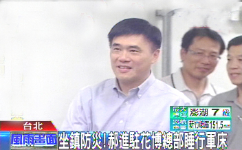 中新網(wǎng)9月19日電 據(jù)臺灣TVBS電視臺報道,臺北市長郝龍斌18日晚間進(jìn)駐花博營運總部,聽取最新臺風(fēng)動態(tài)簡報,簡報結(jié)束后,直接安排在總部過夜,就睡在一張簡單的行軍床上,隨時做好機(jī)動準(zhǔn)備。
