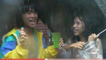 影片一開始,出現(xiàn)一名戴著假發(fā),穿著透明雨衣,裸上半身只穿四角褲的男大學(xué)生,當(dāng)起記者來,夸張地演出被強風(fēng)吹倒在地,不但藍色雨傘開了花,整個人還翻了過去。接著竟然SNG連線起來。