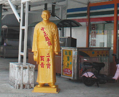 黃姓老板說,他沒有任何政治信仰,只因店正好開在東港鎮(zhèn)中正路上,“我心想既然在中正路開店,就取名中正超商”;后來又想,如果店門口再擺一座蔣中正銅像,“那就更傳神了!”