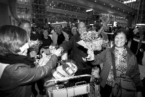 昨晚,首批被困北京游客抵京。20時剛過,游客紛紛走下飛機,多為白發(fā)老人。在接機口,神舟國旅工作人員將鮮花送到老人手上,老人們表示感謝,“我們命大,感謝大家關(guān)心!