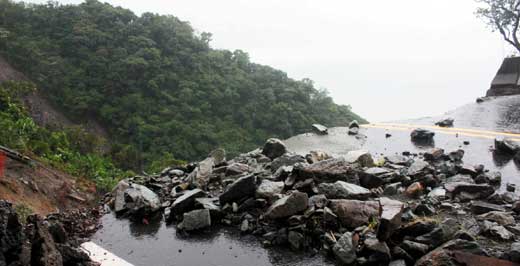 “鲇魚(yú)”帶來(lái)豪大雨沖毀蘇花公路,112至116公里處大面積坍方,多人受困,位在蘇花公路入口的東澳橋前晚就拉起警戒線,警告前方的路危機(jī)四伏。記者昨天上午7時(shí)從花蓮這頭118里處挺進(jìn)宜蘭,來(lái)回5個(gè)小時(shí)的直擊之旅,沿途碎石、斷木橫臥,山壁不時(shí)噴出猛泉,湍急而下,臺(tái)九線頓成滑水道,走在路面像溯溪。