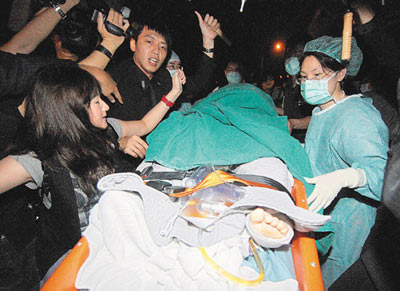 Selina24日一下專(zhuān)機(jī),即被救護(hù)車(chē)火速送往林口長(zhǎng)庚醫(yī)院,當(dāng)時(shí)她從頭到腳都包著綠色床單,躺在擔(dān)架床上,她的四周還有十多名經(jīng)紀(jì)公司人員,撐傘擋住記者鏡頭,完全看不到她的表情,她也沒(méi)有發(fā)言,記者則不斷推擠,現(xiàn)場(chǎng)十分混亂。