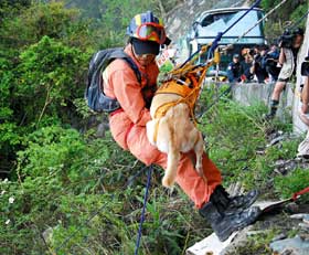 臺北縣搜救隊副隊長吳宏益說,前天帶來的兩只搜救犬,由隊員抱著垂降兩、三百米執(zhí)行搜救,但狗兒過度驚慌,加上斜坡至少七十度,狗兒嚇得連站都站不穩(wěn),“一緊張,就發(fā)揮不了功能,今天就不帶出門了”。