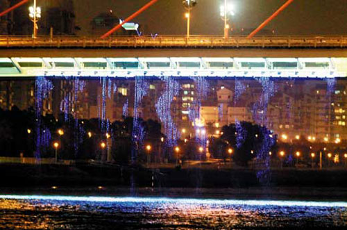 最適合夜間欣賞的大佳展區(qū),25日夜飄起毛毛雨,但號(hào)稱(chēng)亞洲最大的戶外數(shù)位水幕未受影響。各式花博文字、圖形隨一波波水幕傾瀉而下,基隆河岸長(zhǎng)1250米的堤壁更可見(jiàn)夜光黑面琵鷺、油桐花閃閃發(fā)光,民眾都撐傘、穿起雨衣在河畔靜靜瀏覽河景。
