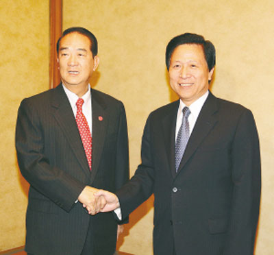 11月1日晚,中共江蘇省委書記、省人大常委會主任梁保華在南京金陵飯店會見了親民黨主席宋楚瑜和副主席張昭雄一行。中共江蘇省委副書記、省長羅志軍,海峽兩岸關系協(xié)會常務副會長李炳才,中共江蘇省委常委、南京市委書記朱善璐一同參加會見。