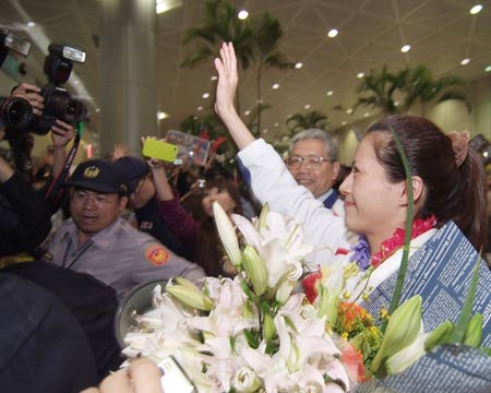 楊淑君22日晚18時(shí)50分搭機(jī)隨隊(duì)返臺(tái)。從步出登機(jī)門(mén),到入境大廳的過(guò)程中,不少旅客高喊楊淑君加油,也有免稅店的店員、入出境旅客頻頻向她比出V字型勝利的手勢(shì)。