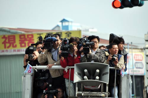 新北市長(zhǎng)選舉進(jìn)入倒數(shù)計(jì)時(shí),選舉結(jié)果牽動(dòng)藍(lán)綠版圖消長(zhǎng),媒體攝影記者隨車(chē)隊(duì)采訪掃街,鏡頭不放過(guò)每一個(gè)畫(huà)面。但擠在臨時(shí)充當(dāng)采訪車(chē)的貨車(chē)上采訪,相當(dāng)辛苦與危險(xiǎn)。 “中央社”圖