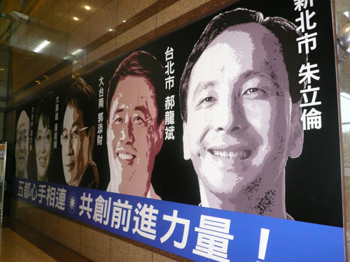 國民黨當初為因應“五都”選舉,特別在中央黨部1樓大廳兩側張貼巨型的“五都”市長候選人看板,訴求“‘五都’心手相連,共創(chuàng)前進力量!笨窗迳,新北市長候選人朱立倫、臺北市長候選人郝龍斌、臺南市長候選人郭添財、高雄市長候選人黃昭順、臺中市長候選人胡志強的照片一一呈現(xiàn)。