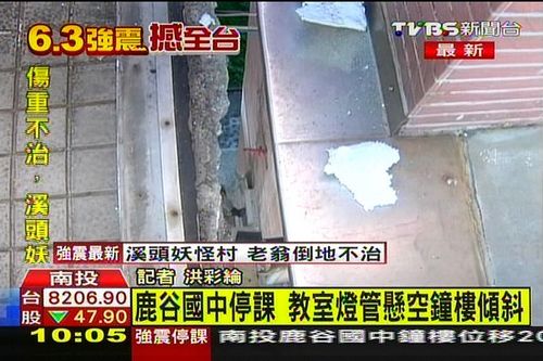 中新網(wǎng)6月3日電 據(jù)臺灣TVBS網(wǎng)站報道,6月2日13時43分,臺灣南投縣(北緯23.9度,東經(jīng)120.9度)發(fā)生6.7級地震(臺灣島內(nèi)氣象部門測定為6.3級),震源深度9.0公里。南投鹿谷中學(xué)也受到地震影響,校園內(nèi)多處毀損,3日停課一天。