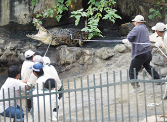 由于無人敢接近河口鱷,保育員采繩索硬拖拉法,八名保育大漢像拔河一般,將河口鱷硬拉進長鐵籠內(nèi)。隨后又以同樣模式,再硬拖重約一百三十公斤母鱷進入另一鐵籠,以吊車先后安移入新居,與凱門鱷隔欄而居。